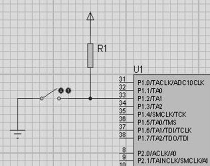 В программе используются побитовые операции Си, «|=» установит соответствующий значению справа бит в регистре слева в единицу, а «&= ~» напротив установит его в 0. В данном примере по нажатию на кнопку (P1.3) происходит прерывание, которое меняет состояние двух светодиодов (P1.0 и P1.6). PxIE разрешает прерывания для пинов порта Px. Значение «1», записанное в определенный разряд позволяет получать прерывания от определенного пина. PxIES определяет по какому уровню сигнала будет происходить прерывание. В нашем случае это означает, что единица, помещенная в конкретный разряд данного регистра, позволит получать событие нажатия кнопки. И наоборот, ноль позволит получать событие отпускания кнопки. На схеме подключения (рисунок 1.26) резистор R1 нарисован показательно, на самом деле он находится внутри микроконтроллера и включается регистром P1REN.