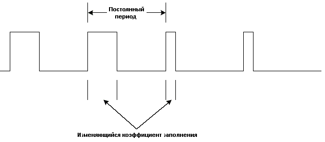 Сигналы ШИМ (широтно–импульсная модуляция) представляют собой цифровые сигналы с постоянной частотой и меняющимся коэффициентом заполнения. Пример таких сигналов приведен на рисунке 1.28.