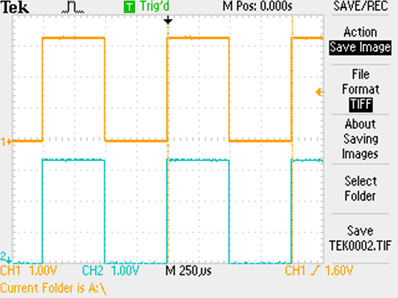 Имейте в виду различие между структурными типами данных двух регистров. Это различие определяется секундным действующим режимом, называющимся “High Resolution PWM” (HRPWM), который доступен только для сигнальной линии ePWMxA. Для того, чтобы поддерживать этот режим, TI расширили структурный тип для регистра CMPA. В функции «cpu_timer0_isr()», удалите все инструкции, для изменения ширины импульса регистром CMPA. Мы будем использовать фиксированную ширину импульса для этого упражнения, первоначально 50% для как ePWM1A так и для ePWM1B. Скомпилируйте, загрузите и протестируйте. Теперь скомпилируете, загрузите и протестируйте модифицированный проект. На экране осциллографа сигналы ePWM1A и ePWM1B должны выглядеть похожими на следующий график Рисунок (2.53).