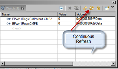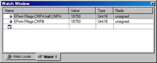 Остановите выполнение кода: – Target → Halt, followed by; – Target → Reset → Reset CPU. Теперь откройте Контрольное Окно View → Watch. В окне «Watch 1» добавьте две переменные: EPwm1Regs.CMPA.half.CMPA EPwm1Regs.CMPB