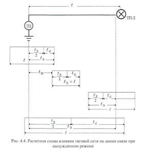 т - количество равномерно распределенных электровозов в пределах плеча питания; I - длина плеча питания тяговой сети при вынужденном режиме, км; cos sin Rtc; Хtc - параметры тяговой сети (табл. 4.1); Km= Км - численный коэффициент, характеризующий уменьшение эквивалентного тока Iэкв по сравнению с Iрез; 1н - расстояние от места расположения тяговой подстанции до начала участка, подверженного влиянию, км; Sобщ=Sp· Sоб; (4.18) SР - коэффициент экранирования рельсов. Таблица 4.1. Параметры тяговой сети (f=50 Гц)
