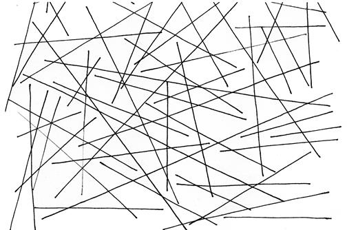 Следующее упражнение (рис. II.1.2) – это проведение параллельных линий. Вдоль листа справа и слева поставим точки с интервалом 1 см и попробуем их соединить.