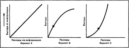 В начале главы мы сделали различие между данными и информацией, указав, что информация — это данные, просеянные для конкретных людей, проблем, целей и ситуаций. Информация необходима для рационального решения проблем. Порой, однако, необходимая для принятия хорошего решения информация недоступна или стоит слишком дорого. В стоимость информации следует включить время руководителей и подчиненных, затраченное на ее сбор, а также фактические издержки, например, связанные с анализом рынка, оплатой машинного времени, использованием услуг внешних консультантов и т.п. Поэтому руководитель должен решить, существенна ли выгода от дополнительной информации, насколько само по себе важно решение, связано ли оно со значительной долей ресурсов организации или с незначительной денежной суммой. Если информацию получить по приемлемой цене непросто, но такая возможность скоро появится, самое правильное для руководителя — отложить принятие решения. Здесь, правда, сделано допущение, что время не является критическим фактором и потери от задержки будут более чем перекрыты выгодой от принятия более качественного решения на основе дополнительной информации. Выгода и издержки по большей части субъективно оцениваются руководителем, что, в особенности, относится к оценке руководителем стоимости собственного времени и ожидаемых в результате принятия решения улучшений. На рис. 7.4. проиллюстрированы три варианта обстоятельств, с которыми может столкнуться руководитель, оценивая затраты и выгоду от дополнительной информации. По варианту «А» выгода от каждой дополнительной единицы информации равна затратам на ее получение. (Это напоминает концепцию предельного дохода и предельных издержек в экономических науках.) В той мере, в какой руководство готово платить за получение дополнительной информации, оно будет иметь дополнительную выгоду. Однако ограничения временные и интеллектуальных возможностей менеджера в плане усвоения и использования все большего количества информации должны, в конечном счете, сделать покупку дополнительной информации экономически нецелесообразной.