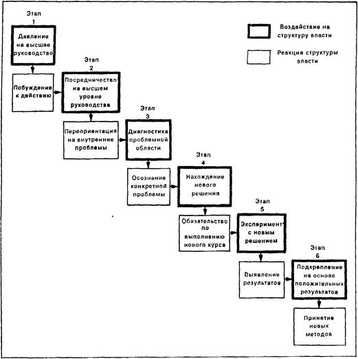 ЭТАП 4. НАХОЖДЕНИЕ НОВОГО РЕШЕНИЯ И ОБЯЗАТЕЛЬСТВА ПО ЕГО ВЫПОЛНЕНИЮ. После того, как признано существование проблемы, руководство ищет способ исправления ситуации. В большинстве случаев руководство также должно заручиться согласием на проведение нового курса тех, кто отвечает за его выполнение. Комментируя этот этап, Грейнер говорит: «Всегда имеется искушение, особенно для структур власти, применить старые решения к новым проблемам. Таким образом, возникает необходимость четвертого этапа — отыскания новых и уникальных решений, которые были бы поддержаны всей структурой власти». ЭТАП 5. ЭКСПЕРИМЕНТ И ВЫЯВЛЕНИЕ. Организация редко берет на себя риск проводить крупные изменения одним махом. Она скорее начнет проводить испытания планируемых изменений и выявлять скрытые трудности, прежде чем внедрять новшества в крупных масштабах. С помощью механизмов контроля руководство определяет, в какой степени планируемые изменения помогают поправить неудовлетворительное положение вещей, как их воспринимают и как можно улучшить их осуществление. Руководство, например, может обнаружить, что некоторым людям необходимо дать дополнительные полномочия или дополнительную подготовку, или нужно создать комитет, который следил бы за выполнением этой программы, или одна из групп оказывает сильное сопротивление этим нововведениям. Путем эксперимента и выявления отрицательных последствий руководство сможет скорректировать свои планы, чтобы добиться их более высокой эффективности. ЭТАП 6. ПОДКРЕПЛЕНИЕ И СОГЛАСИЕ. На последнем этапе необходимо мотивировать людей, чтобы они приняли эти изменения. Этого можно достигнуть, убеждая подчиненных, что изменение выгодно как организации, так и им лично. Как объясняет Грейнер, когда каждый человек получает стимул для того, чтобы изменения прошли успешно, «можно ожидать, что большая часть людей на всех уровнях примет методы, с помощью которых осуществляются эти изменения». Возможные способы подкрепить согласие на новшества — похвала, признание, продвижение по службе, повышение оплаты труда за более высокую производительность, а также разрешение тем, кто участвует в проведении изменений, принимать участие в обсуждении того, как проходит этот процесс, какие возникают проблемы, какие поправки должны быть внесены и т.д.