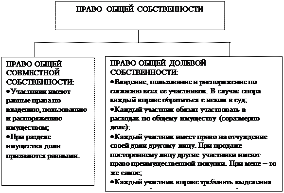 Право собственности закрепляет экономические отношения собс-твенности. Право собственности в объективном смысле - совокупность правовых норм, закрепляющих, регулирующих и охраняющих состояние принадлежности материальных благ конкретным лицам. Право собственности в субъективном смысле - мера возможного поведения собственника. Собственник вправе владеть, пользоваться и распоряжаться своим имуществом по своему усмотрению и в своих интересах. Правомочие владения есть основанная на законе возможность иметь у себя имущество, обладать им. Правомочие пользования - основанная на законе возможность извлечения полезных свойств из имущества, потребления его. Правомочие распоряжения означает возможность определить юридическую судьбу имущества путем изменения его принадлежности, состояния или назначения. Собственник может использовать свое имущество для предприни-мательской и любой иной деятельности, не запрещенной законом. Правомочия собственника не безграничны. Он несет бремя содер-жания принадлежащего ему имущества, риск случайной гибели и порчи. Осуществление права собственности не должно нарушать прав и охраняемых законом интересов других лиц. Основания возникновения права собственности: * создание новой вещи; * приобретение имущества на основании договора купли-продажи, мены, дарения или иной сделки; * получение имущества по наследству; * реорганизация юридического лица (право собственности переходит к правопреемникам); * право собственности на бесхозяйные вещи, т.е.: - вещи, которые не имеют собственника; - собственник которых неизвестен; - от которых собственник отказался. Бесхозяйные вещи могут быть приобретены различными способами в зависимости от того, как они оказались у владельца (находка, клад, давность владения). Приобретательная давность означает, что лицо, не являющееся собственником, но добросовестно, открыто и непрерывно владеющее как своим собственным недвижимым имуществом в течение 15-и лет либо иным имуществом в течение 5-и лет, приобретает право собственности на это имущество. ¨ Внесение полностью паевого взноса за квартиру, дачу, гараж (относится к членам кооператива); ¨ Обращение в собственность общедоступных для сбора вещей. Кроме того, имущество, находящееся в государственной или муниципальной собственности, может быть передано его собственником в собственность граждан и юридических лиц (приватизации). Основания прекращения права собственности: * отчуждение собственником своего имущества другим лицам; * отказ собственника от права собственности; * гибель и уничтожение имущества и т. д. Прекращение права собственности помимо воли собственника по общему правилу не допускается. Собственник может прекратить право собственности различными способами: отчуждением своего имущества другим лицам, отказом от права собственности и т.д. Принудительное изъятие у собственника имущества может производиться в следующих случаях: * обращения взыскания на имущество по обязательствам; * отчуждения имущества, которое в силу закона не может принадлежать данному лицу; * отчуждения недвижимого имущества в связи с изъятием участка; * выкупа бесхозяйственно содержимых культурных ценностей, домашних животных; * реквизиции (в случае стихийных бедствий, аварий, эпидемий и т. п.); * конфискации (за совершение преступл