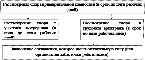 Трудовые споры могут быть индивидуальными и коллективными. Индивидуальный трудовой спор – неурегулированные разногласия между работником и работодателем по вопросам применения трудового законодательства, коллективного договора, соглашения, трудового договора (в том числе об установлении или изменении индивидуальных условий труда), о которых заявлено в орган по рассмотрению индивидуальных трудовых споров. Такими органами являются комиссии по трудовым спорам (КТС) и суды. Комиссии по трудовым спорам создаются в организациях (или в структурных подразделениях) из равного числа представителей работодателя и работников. Представители работодателя назначаются в КТС руководителем организации, а от работников избираются на общем собрании. Комиссии по трудовым спорам рассматривают индивидуальные трудовые споры, возникающие в организации, за исключением споров, по которым установлен другой порядок их рассмотрения (например, споры об увольнении). Индивидуальный трудовой спор рассматривается в КТС, если работник не урегулировал разногласия при непосредственных переговорах с работодателем. Работник может обратиться в комиссию по трудовым спорам в трехмесячный срок со дня, когда он узнал или должен был узнать о нарушении своего права. Комиссия обязана рассмотреть заявление работника в десятидневный срок. Спор рассматривается в присутствии работника. В случае неявки работника рассмотрение его спора откладывается. В случае вторичной неявки работника без уважительных причин вопрос снимается с рассмотрения, но это не лишает работника права подать заявление повторно в пределах трехмесячного срока. КТС принимает решение тайным голосованием простым большинством голосов. Решение комиссии подлежит исполнению в течение трех дней по истечении десяти дней, предусмотренных на обжалование решения комиссии в суд. Если администрация не исполняет решение КТС, работнику выдается комиссией удостоверение, являющееся исполнительным документом. В течение трех месяцев работник может предъявить удостоверение судебному приставу, который должен привести решение КТС в исполнение в принудительном порядке.
