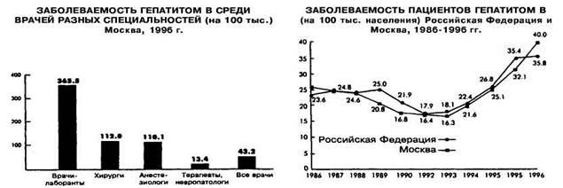 Среди заболеваний, относящихся к ВБИ, большинство связанно с медицинскими вмешательствами. В частности, это постинфекционные осложнения (инфильтраты, абсцессы, флегмоны). Следует отметить, что многочисленные литературные данные не позволяют получить объективное представление о частоте ВБИ, развивающихся в результате диагностических и лечебных процедур, вакцинаций и профилактических осмотров. Итак, у 69,3% госпитализированных пациентов с постинфекционными нагноениями, инъекция производилась медицинскими работниками поликлиник и скорой помощи. Смертность пациентов с постинфекционной патологией составляет 2%, так как у 1,7% пациентов происходит генерализация инфекции. Передаче ВИЧ и вирусов гепатита В, С, Д также способствуют инъекции. Так, серьезный первичный очаг ВИЧ был зарегистрирован в 1988 г. в Элисте и соседних городах — 250 инфицированных. Сегодня, учитывая увеличение ВИЧ-инфицированных, в том числе среди медицинского персонала, риск передачи ВИЧ во время диагностических и лечебных процедур значительно возрастает. Вирусные гепатиты В, С, Д составляют 6-7% в общей структуре ВБИ. При росте заболеваемости гепатитом В в Российской Федерации (рис. 1.1) можно ожидать в ЛПУ увеличения риска инфицирования вирусом гепатита В.