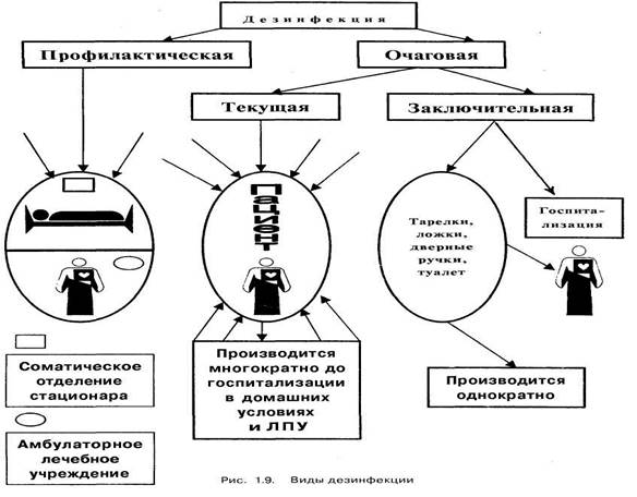 Тактика и способы профилактической и очаговой дезинфекции существенно отличаются. «Следует помнить, что дезинфекция проводится с учетом эпидемической опасности и значимости ряда предметов и оборудования как предполагаемых факторов риска в реализации того или иного механизма передачи ВБИ». Чтобы дезинфекция была эффективной, нужно знать назначение средств и методов дезинфекции, способы и режимы их применения для обеззараживания объектов, рекомендуемую для этих целей аппаратуру и приборы, особенности обеззараживаемых объектов, способы защиты персонала, проводящего дезинфекцию, и находящихся в помещении пациентов. Физические средства дезинфекции: высушивание, воздействие высокой температурой (сжигание, прокаливание, кипячение), пар, горячий воздух, ультрафиолетовое облучение и др. При ультрафиолетовом облучении антимикробное действие обеспечивается УФ-лучами, исходящими от специальных настенных, потолочных, переносных и передвижных бактерицидных ультрафиолетовых установок. Их используют с целью снижения микробной обсемененности воздуха и поверхностей различных объектов ЛПУ. Сухой горячий воздух при температуре более 100 °С изменяет органические вещества, растительные и животные волокна, а свыше 170 °С — обугливает их. Он оказывает бактерицидное, вирулицидное, фунгицидное, спороцидное и инсектицидное действие. Сухой горячий воздух (160°-180 °С) применяют в воздушных стерилизаторах, камерах и аппаратах для дезинфекции посуды, инструментов, изделий медицинского назначения из металла, стекла, силиконовой резины, а в камерах при температуре 80-100 °С — для дезинсекции одежды, постельных принадлежностей и других вещей. Водяной пар проникает вглубь обрабатываемых объектов, оказывает сильное антимикробное действие: вегетативные формы патогенных и условно-патогенных микроорганизмов погибают от воздействия пара при температуре 80°С, а споровые формы при температуре 120°С в течение 10 мин. Водяной насыщенный пар под давлением используют в дезинфекционных камерах для обеззараживания одежды, постельных принадлежностей, а в паровых стерилизаторах для дезинфекции аптечной и лабораторной посуды, изделий медицинского назначения и предметов ухода из стекла, коррозионностойкого металла, изделий из текстильных материалов, резины, латекса и отдельных полимерных материалов. Горячая вода (60-100°С) оказывает антимикробное действие в отношении многих микроорганизмов, вегетативные формы которых погибают в течение 30 мин. Горячую воду с добавлением моющих средств используют для механического удаления загрязнений и микроорганизмов при стирке белья, мытье посуды, уборке. Кипячение в воде при температуре 80°С в течение 15-45 мин применяют для обеззараживания белья, посуды, инструментов, изделий медицинского назначения, предметов ухода за больными, игрушек и других объектов. При добавлении в воду 2-процентного раствора натрия гидрокарбоната антимикробное действие кипячения усиливается. При соблюдении всех условий данный метод обеспечивает дезинфекцию высокого уровня. Оборудованием инструментарий должны быть тщательно очищены, положены в контейнер и запиты водой. Вода нагревается до кипения. Дезинфекция начинается с момента закипания и продолжается 5 мин. Для предупреждения коррозии в воду добавляется 2-процентный раствор натрия 