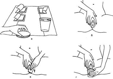 1. Уточнить у пациента понимание цели предстоящего исследования и получить его согласие (информированное согласие на процедуру получает врач). В случае неинформированности пациента — уточнить у врача дальнейшую тактику. 2. Объяснить пациенту цель предстоящей подготовки к исследованию и ее последовательность. 3. А. Подготовка женщины (рис. 1.10)