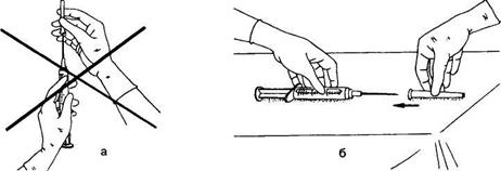 Рис. 9.28. Надевание защитного колпачка: а — опасный прием; б — безопасный прием.