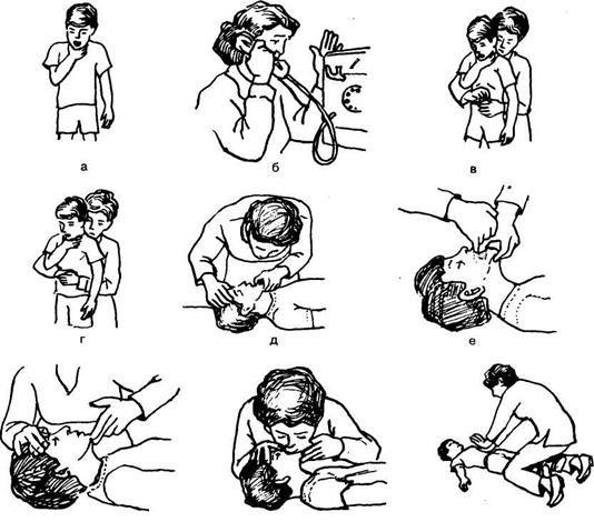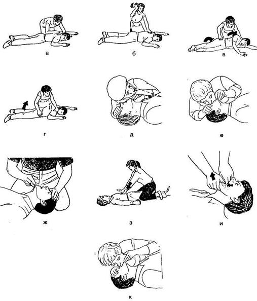 Рис. 15.18. Помощь взрослому пострадавшему, находящемуся без сознания, при полной закупорке дыхательных путей.