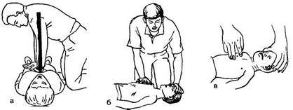 Рис. 15.28. Расположение рук при непрямом массаже у взрослого (а), ребенка (б), младенца (в).