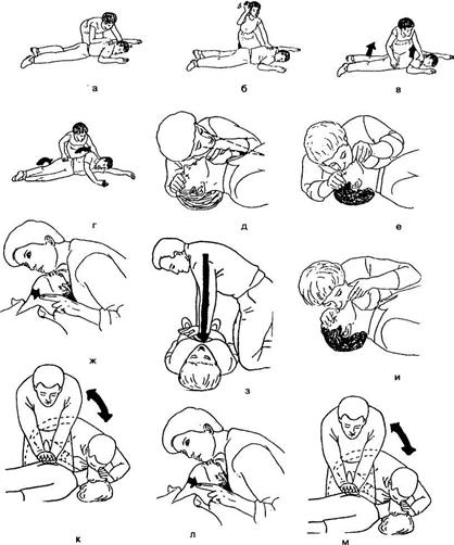 Рис. 15.30. СЛР младенца. 8. Сделать 5 компрессий на грудину: • держать плечи перпендикулярно руке; • надавливать на грудину, чтобы она совершала колебательные движения (амплитуда 4—5 см); • сделать 5 компрессий на грудину приблизительно за 3 с; • нажимать на грудину и прекращать компрессию бережно, не отнимая руку от грудной клетки. 9. Сделать 1 медленное дыхание: • открыть дыхательные пути, слегка разгибая голову и поднимая подбородок • зажать нос, плотно охватить своими губами рот ребенка; • •сделать 1 медленное дыхание продолжительностью 4 с; • наблюдать за грудной клеткой ребенка при проведении ИВЛ; 10. Повторять циклы «компрессии — дыхания»: • сделать еще 9 циклов, состоящих из 5 компрессий и 1 дыхания (10 циклов за 1 мин). 11. Повторно определить наличие пульса: • пальпировать пульс около 5 с. Если у ребенка есть пульс и дыхание: • поддерживать дыхательные пути открытыми; • наблюдать за дыханием; • ожидать приезда «скорой помощи». Если у ребенка пульс появился, а дыхания нет: • делать ИВЛ до приезда «скорой помощи». Если у ребенка нет ни пульса, ни дыхания: • продолжать СЛР до приезда «скорой помощи». 12. Продолжать циклы «компрессии — дыхания»: • правильно расположить руку на грудине для непрямого массажа сердца; • продолжать циклы, состоящие из 5 компрессий и 1 дыхания; • повторно определять пульс через несколько минут. Date: 2015-06-06; view: 916; Нарушение авторских прав |