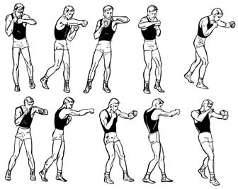 Исходное положение: ноги на ширине плеч, стопы параллельно, руки согнуты в локтях, кисти несколько сжаты в кулаки и направлены вперед, большие пальцы кверху. Голова опущена, боксер смотрит прямо. При перемещении массы тела на правую ногу туловище поворачивается вправо, одновременно левая рука выполняет прямой удар. Левая нога несколько.ослабляется, пятка отрывается от пола, левое бедро поворачивается вправо. При перемещении массы тела на левую ногу имитируется удар правой рукой, правое бедро и туловище поворачиваются влево. Перемещая массу тела с одной ноги на другую, надо попеременно выносить вперед то левую, то правую руку. Это упражнение выполняется также с шагом в сторону, вперед и назад. При перемещении массы тела на левую ногу проводят прямой удар левой с поворотом туловища вправо (действия одноименные). Перемещая массу тела на правую ногу, наносят прямой удар правой с поворотом туловища влево. Эти упражнения выполняются также с шагом в сторону, вперед и назад. Из левостороннего бокового положения боевой стойки, стоя на месте с переносом массы тела на левую ногу, выполняется прямой удар левой рукой, затем правой (разноименный). С переносом массы тела на правую ногу проводится прямой удар правой (одноименный), потом прямой удар левой (разноименный). При этом туловище и бедро соответственно поворачиваются, как и при упражнении в прямой позиции. Упражнения в нанесении прямых ударов в голову из боковой позиции (как одноименные, так и разноименные) выполняются с шагом вперед, в стороны и назад в левостороннем и в правостороннем положении. Выполнение прямого удара левой в туловище с уклоном вправо производится следующим образом. Из левостороннего боевого положения сделать уклон туловища вправо с прямым ударом левой. Кулак поворачивается тыльной стороной кверху. Масса тела располагается на обеих, несколько согнутых, ногах или больше на левой ноге. Выполнение прямого удара правой в туловище производится с уклоном туловища влево. В такой же последовательности (вначале одноименный, затем разноименный с попеременным перенесением массы тела с ноги на ногу, в прямой и боковой позиции, с передвижением вперед, назад и в стороны) изучается и совершенствуется техника выполнения одиночных ударов сбоку и снизу (рис. 16 и 17).