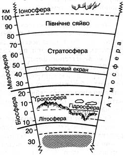 Рис. 2.1. Геосфера Землі Атмосфера (грец. «атмас» – пара) – це газова оболонка Землі, маса якої становить 5,15 ∙ 1015т. Упродовж трьох мільярдів років з моменту виникнення атмосфери її склад і властивості неодноразово змінювалися, однак упродовж останніх 50 млн років, за припущенням учених, вони стабілізувалися. Якби атмосфери не існувало, то коливання добової температури сягали б ±200 °С. Атмосфера простирається вгору на 100 км. В ній виділяють тропосферу, стратосферу, мезосферу, іоносферу та екзосферу. Крім того, за хімічним складом атмосферу Землі поділяють на нижню (до 100 км) – гомосферу, яка має склад, подібний до приземного повітря, і верхню – гетеросферу неоднорідного хімічного складу. Тропосфера (грец. «троп» – зміна) – це нижня частина атмосфери, яка прилягає до літосфери і в якій знаходиться понад 80 % усієї маси. її висота визначається інтенсивністю вертикальних потоків повітря, викликаних нагріванням земної поверхні. Тому на екваторі її висота сягає 16- 18 км, у помірних широтах – до 10-11 км, а на полюсах – до 8 км. З висотою температура повітря закономірно знижується в середньому на 0,6 °С на кожні 100 м і на висоті 10-15 км досягає -60...-70 °С. Цей шар атмосфери істотно впливає на клімат Землі. У ньому містяться значні маси води (у вигляді водяної пари і хмар), пилу й диму, що переміщуються повітряними потоками на великі відстані. Стратосфера (лат. stratum – шар) знаходиться вище від тропосфери і простягається на висоту 50-55 км над Землею. У ній міститься озоновий шар (25-40 км). Вміст озону в атмосфері є до 70 км. Завдяки наявності озонового шару температура в стратосфері зростає залежно від висоти до 1000 °С. Мезосфера (грец. «мезос» – середній) – шар атмосфери, верхня межа якого сягає висоти 80 км. Головна її особливість – зниження температури до -75...-90 °С (а за деякими даними -120 °С) у її верхній частині. Тут фіксують сріблясті хмари, що складаються з кристаликів льоду. Іоносфера (термосфера; грец. «термес» – теплий) розміщується на висоті більш як 80 км. Температура в цій зоні значно підвищується (понад 1000 °С). Під дією ультрафіолетового випромінювання Сонця гази перебувають у йонізованому стані. З йонізацією пов’язане світіння газів і виникнення полярного сяйва. Іоносфера має здатність багаторазово відбивати радіохвилі (електромагнітні хвилі), що забезпечує дальній радіозв’язок на Землі. Екзосфера (магнітосфера) оточує Землю на висоті понад 800 км. її товщина сягає 200-300 км, а температура перевищує 2000 °С. Швидкість руху газів наближається до критичної величини – 11,2 км/с. У ній переважно містяться атомарний водень і гелій, які утворюють навколо Землі корону, що поширюється на висоту 20 тис. км. Атмосфера Землі відіграє величезну роль в існуванні біосфери. Проте не менш важливе значення для життя, зокрема процесів його зародження (і рої витку, має водна оболонка Землі – гідросфера. Гідросфера (грец. «гідор» – вода) – це водна оболонка Землі, яка включає Світовий океан, води суші (ріки, озера, болота, льодовики) та підземні коди. На частку Світового океану припадає 631 млн км2 поверхні земної кулі, тобто 70,8 %. Температура океанської і морської води постійно змінюється як на поверхні, так і в глибині, і залежить переважно від клімату й погоди. В екваторній зоні вона становить близько 30-35°С, а в полярних морях знижується до 0...-2°С. Велика маса океанічних вод, які перебува