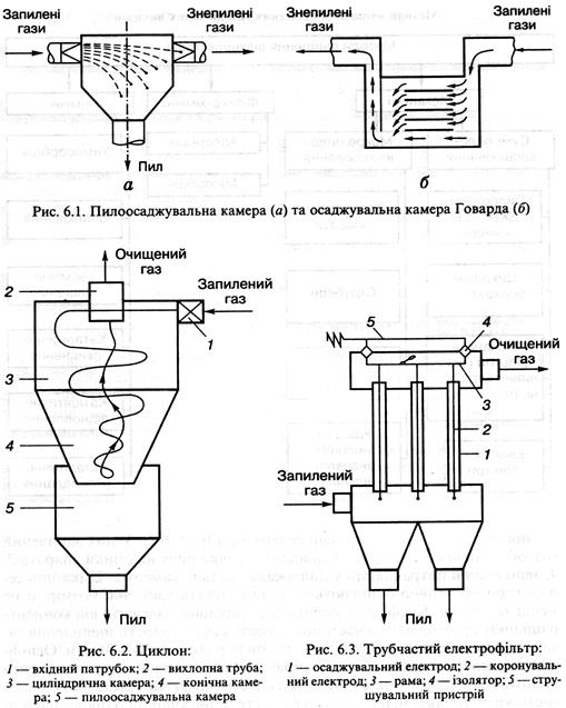 З метою зменшення забруднення атмосферного повітря пилом та іншими шкідливими домішками потрібно на всіх промислових підприємствах організувати ефективне очищення відхідних газових викидів. Усі методи очищення можна розподілити на три групи: механічні, фізико-хімічні й хімічні (див. схему). Вибір методу очищення залежить від кількості відхідних газів та їхнього складу. Механічні методи застосовують для очищення вентиляційних та інших газових викидів від грубодисперсного пилу. В них пил відокремлюється під дією сили гравітації, інерції або відцентрової сили. Вибираючи систему пиловловлювання, слід враховувати швидкість газового потоку, вміст пилу та його фізико-хімічні властивості, розмір часточок і наявність водяної пари. Існує два види пиловловлювання: сухе і мокре. З екологічного й економічного погляду досконалішими є сухі пиловловлювачі. Вони дають змогу повернути у виробництво вловлений пил, тоді як при мокрому утворюються водяні суспензії, переробка яких потребує більших матеріальних затрат. Недоліком сухого пилоочищення є те, що воно забезпечує високий ступінь очищення тільки у разі малої запиленості відхідних газів. Механічне сухе пиловловлювання здійснюють в осаджувальних камерах, циклонних сепараторах, механічних та електричних фільтрах. В осаджувальних камерах очищають гази з грубодисперсними часточками пилу розміром від 50 до 500 мкм і більше (рис. 6.1, а). Ефективнішою є осаджу-вальна камера Говарда (див. рис. 6.1, б), в якій газовий потік розбивається горизонтальними пластинами на окремі секції. Незважаючи на незначний аеродинамічний опір і невисоку вартість, ці апарати застосовують рідко через труднощі їх очищення. З них відхідні гази направляють в інші, ефективніші апарати для подальшого очищення.