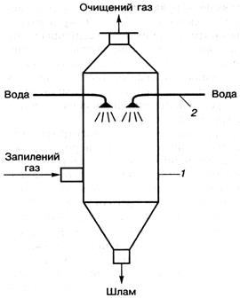 Рис. 6.4. Порожнистий форсунковий скрубер: 1 – корпус; 2 – форсунки
