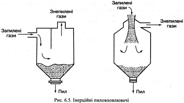 Значно поширеніші циклонні сепаратори (рис. 6.2). У них запилений газ, обертаючись по спіралі, відкидає часточки пилу на стінки апарата 3, 4, звідки вони потрапляють у пилоосаджувальну камеру 5. Циклонні сепаратори ефективно очищають гази, що містять часточки розміром не менш як 25 мкм. Коефіцієнт корисної дії циклонів залежить від концентрації пилу і розмірів його часточок. Середня ефективність знепилення газів у циклонах становить 78-86 % для пилу розміром 30-40 мкм. Основний недолік циклонів – значне абразивне спрацювання частин апарата пилом. Тому ці частини вкривають синтетичними матеріалами або зносостійкими сплавами, що здорожує конструкцію апарата. Циклони використовують для очищення запилених газів і повітря з великими часточками в різних галузях промисловості.