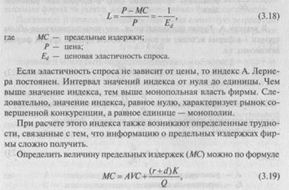В условиях совершенной конкуренции на товарном рынке и эффективного финансового рынка норма прибыли будет одинаковой (нулевой) для всех видов активов. Если норма прибыли какого-либо актива фирмы выше конкурентной нормы, то этот вид инвестирования становится более предпочтительным, а рынок неконкурентным. Индекс (коэффициент) А. Лернера является показателем степени конкурентности рынка. Его применение базируется на использовании данных о предельных издержках фирмы и эластичности спроса. Из курса микроэкономики известно, что при условии максимизации прибыли цена и предельные издержки связаны друг с другом через показатель эластичности спроса по цене. Исходя из этого положения А. Лернер предложил в 1934 г. индекс, определяющий монопольную власть: