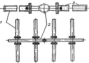 Рис 1. Аэратор решетчатый тканевый 1 — перфорированные трубки, 2 — коллектор, 3—капроновая ткань. Механическая аэрация. Системы механической аэрации в аэротенках известны давно, но широкое распространение они получили за последнее десятилетие. Механические аэраторы весьма разнообразны в конструктивном отношении, но принцип их работы одинаков: вовлечение воздуха непосредственно из атмосферы вращающимися частями аэратора (ротором) и перемешивание его со всем содержимым аэротенка. Все механические аэраторы можно классифицировать следующим образом: 1) по принципу действия — импеллерные (кавитационные) и поверхностные; 2) по плоскости расположения оси вращения ротора — с горизонтальной и вертикальной осью вращения; 3) по конструкции ротора — конические, дисковые, цилиндрические,, колесные, турбинные и винтовые. Смешанная, или комбинированная, система сочетает в себе элементы пневматической и механической аэрации.