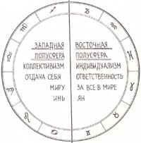 Рис.8 Нижняя полусфера — Инь, женское начало, пассивная. Задача, стоящая перед нижней полусферой, это — ориентация на авторитет, учение, накапливание сил; человек является проводником, долго учится, потом отдает. В течение жизни человек может перейти от задач одной полусферы к задачам другой. Верхняя полусфера — Ян, мужское начало, активная, дневная полусфера. Человек передает свой накопленный опыт; чем больше планет в верхней полусфере, тем больше возможностей для передачи (Лермонтов). Деление Зодиака по вертикали (рис. 9)