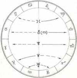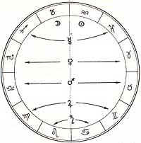 (Пунктиром показаны обители планет, где они еще не проявлены в полную силу). Знак, противоположный обители планеты, называется знаком заточения или изгнания. В изгнании характеристики планет вытеснены, ущербны. Любая планета в изгнании нуждается в исправлении, коррекции, так как она способствует образованию психологического комплекса (оценка, естественно, должна быть альтернативной, если гороскоп не фатален). Если планета в обители проявляется на внешнем плане, то в изгнании она — на внутреннем плане. Планета в изгнании — это прежде всего внутренний источник творческого начала, который нуждается в проявлении, в специальном развитии (рис. 14, 14а).