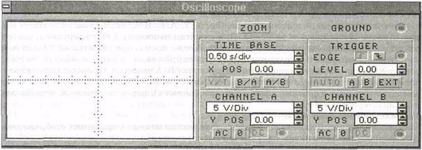 Осциллограф, імітуємий програмою Workbench, являє собою аналог двопроменевого запам'ятовуючого осциллографа і має дві модифікації: просту і розширену. Розширена модифікація по своїх можливостях наближається до кращих цифрових запам'ятовуючих осциллографів. Через те, що розширена модель займає багато місця на робочому полі, рекомендується починати дослідження простою моделлю, а для докладного дослідження процесів використовувати розширену модель. Ви можете підключити осциллограф до уже ввімкненої схеми або під час роботи схеми переставити виводи до інших точок – зображення на екрані осциллографа зміниться автоматично. У ході аналізу роботи схеми нерідко виникає необхідність сповільнити процес моделювання, щоб на екрані осциллографа було зручно візуально сприймати інформацію. Це необхідно, наприклад, при дослідженні перехідних процесів або коли в ході експерименту потрібно переключити ключ у визначений момент. Для цього потрібно збільшити кількість розрахункових точок на цикл. Це можна зробити, вибравши пункт Analysis Options у меню Circuit і установивши в рядку Time domain points per cycle необхідне значення (зазвичай досить 5000 точок). За замовчуванням кількість точок дорівнює 100. Полегшити аналіз осциллограмм може включення режиму Pause after each screen (Пауза після кожного екрана). У цьому режимі розрахунок схеми зупиняється після того, як промінь осциллографа проходить весь екран. Це часто буває необхідним при затрудненнях із синхронізацією зображення на екрані осциллографа. Щоб продовжити розрахунок схеми, виберіть пункт Resume (Продовжити) меню Circuit або натисніть клавішу F9 на клавіатурі. Зупинити процес розрахунку схеми в будь-який момент часу можна натисканням клавіші F9 або вибором пункту Pause (Пауза) у меню Circuit. Продовжити розрахунок можна повторним натисканням клавіші F9 або вибором пункту Resume меню Circuit. Натискання кнопки “Пуск” у правому верхньому куті екрана припиняє розрахунок схеми. На схему виводиться зменшене зображення осциллографа, загальне для обох модифікацій. На цьому зображенні мається чотири вхідних затискачі: Верхній правий затискач – загальний (вивід називають загальним тому, що потенціал на ньому є загальною точкою, відносно якої осциллограф вимірює напругу. Зазвичай цей вивід заземляють, для того, щоб осциллограф вимірював напругу відносно нуля. Тому на панелі осциллографа цей вивід позначений “ground”). Нижній правий – вхід синхронізації, його призначення буде розглянуто нижче. Лівий і правий нижні затискачі являють собою відповідно вхід каналу А (channel А) і вхід каналу В (channel B).