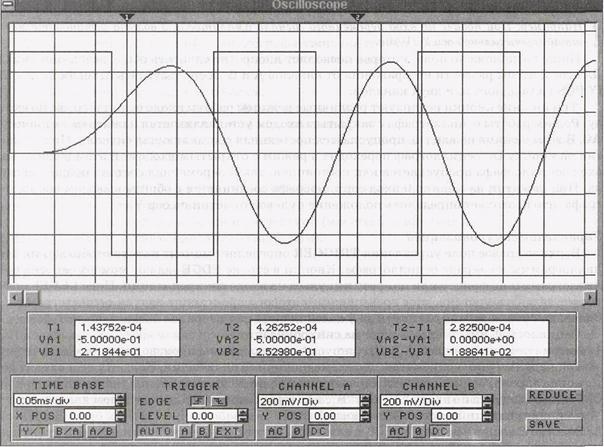 Керування синхронізацією Верхнє праве поле керування TRIGGER визначає момент початку відображення осциллограми на екрані осциллографа. Кнопки в рядку EDGE задають момент запуску осциллограмми по фронту або по зрізу імпульсу на вході синхронізації. Поле LEVEL дозволяє задавати рівень, при перевищенні якого відбувається запуск осциллограми. Значення рівня можна зрушити на 3 розподіли вниз або нагору. 1. Автоматичний режим (AUTO) – запуск осциллограмми проводиться автоматично при підключенні осциллографа до схеми або при її ввімкнені. Коли "промінь" доходить до кінця екрана, осциллограма знову прописується з початку екрана (новий екран). 2. Режими запуску по входу "А" або "B", у яких сигналом, що запускає, є сигнал, що надходить на відповідний вхід. 3. Режим "Зовнішній запуск" (EXT – external). У цьому випадку сигналом запуску є сигнал, що подається на вхід синхронізації. ! Порада: Якщо Ви не бачите сигналу на осциллографі або сигнал слабкий – натисніть кнопку AUTO. Розширена модифікація осциллографа Натискання клавіші ZOOM на панелі простої моделі відкриває вікно розширеної моделі осциллографа. Панель розширеної моделі осциллографа на відміну від простої моделі розташована під екраном і доповнена трьома інформаційними табло, на які виводяться результати вимірів. Крім того, безпосередньо під екраном знаходиться лінійка прокручування, що дозволяє спостерігати будь-який часовий відрізок процесу від моменту включення до моменту вимикання схеми. По суті, розширена модель осциллографа це зовсім інший прилад, що дозволяє набагато зручніше і більш точно проводити числовий аналіз процесів. На екрані осциллографа розташовані два курсори, що позначаються 1 і 2, за допомогою яких можна вимірити миттєві значення напруг у будь-якій точці осциллограмми. Для цього просто перетягніть мишею курсори за трикутники в їхній верхній частині в необхідне положення. Координати точок перетинання першого курсору з осциллограммами відображаються на лівому табло, координати другого курсору — на середньому табло. На правому табло відображаються значення різниць між відповідними координатами першого і другого курсорів. Результати вимірів, отримані за допомогою розширеної моделі осциллографа, можна записати у файл. Для цього натисніть кнопку Save (Зберегти) і в діалоговому вікні введіть ім'я файлу. Файлові привласнюється розширення *.scp. Воно являє собою текстовий файл у ASCII кодах, у якому записані дані про значення напруг у точках підключення осциллографа через інтервал часу, що дорівнює масштабові горизонтального розгорнення. Щоб повернутися до колишнього зображення осциллографа – натисніть клавішу REDUCE, що розташована в правому нижньому куті.