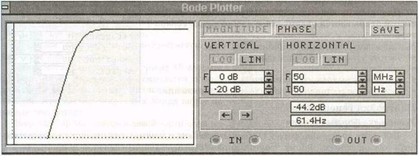 Боде-плоттер має чотири затискачі: два вхідних (IN) і два вихідних (OUT). Для виміру відношення амплітуд або фазового зсуву потрібно підключити додатні виводи входів IN і ОUТ (ліві виводи відповідних входів) до досліджуваних точок, а два інших виводи заземлити. При подвійному щиглику мишею по зменшеному зображенню Боде-плоттера відкривається його збільшене зображення. Верхня панель плоттера Режим (MODE) задає вид одержуваної характеристики: АЧХ або ФЧХ. Для одержання АЧХ натисніть кнопку MAGNITUDE, для одержання ФЧХ – кнопку PHASE.