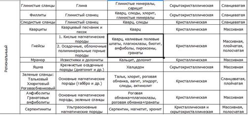 Метаморфические горные породы образуются в результате значительной переработки горных пород в глубинных зонах земной коры, куда они попадают вследствие проявления тектонических процессов. Под метаморфизмом понимают изменение и преобразование горных пород под влиянием различных эндогенных геологических процессов, вызывающих значительные изменения термодинамических условий (прежде всего температуры и давления). Все преобразования в горных породах при процессах метаморфизма происходят путем их изменения в твердом состоянии. Метаморфизму могут подвергаться горные породы любого происхождения – осадочные, магматические и ранее существовавшие метаморфические. Степень изменения первичных горных пород (степень метаморфизма) может быть самой различной – от незначительных преобразований до полного изменения состава и облика пород. Преображение в гнейсы на высшей стадии.