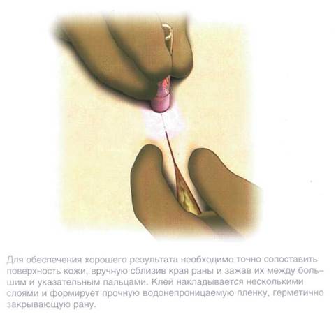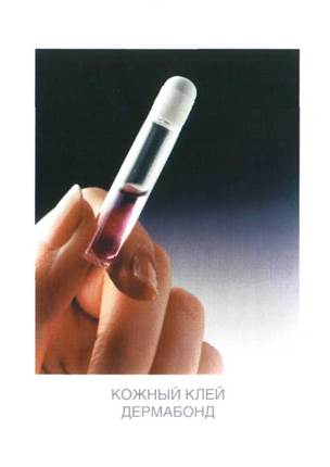 2.3.5 Соединение кожи с помощью клея ДЕРМАБОНД Для соединения кожи можно использовать современный материал - 2-октил цианакрилатный клей. Использование этого материала обеспечивает хорошую адаптацию и великолепный косметический результат. Кроме того, в значительной степени снижается стрессовая нагрузка на пациентов (в особенности детей), связанная с хирургической обработкой ран.