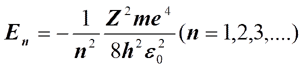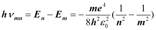 равной разности энергий соответствующих стационарных состояний (Еn и Em — соответственно энергии стационарных состояний атома до и после излучения (поглощения)). При Еm<Еn происходит излучение фотона (переход атома из состояния с большей энергией в состояние с меньшей энергией, т. е. переход электрона с более удаленной от ядра орбиты на более близлежащую), при Еm>Еn — его поглощение (переход атома в состояние с большей энергией, т. е. переход электрона на более удаленную от ядра орбиту). Набор возможных дискретных частот n = (En—Em)/h квантовых переходов и определяет линейчатый спектр атома.