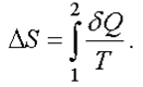 Формула ∆S=∆Q/T справедлива для изотермического процесса и представляет собой термодинамическое определение энтропии. Энтропией называется термодинамическая величина, изменение которой в системе пропорционально ее тепловой энергии, деленной на абсолютную температуру. Для любого процесса можно найти бесконечно малое изменение энтропии, т. е. ее дифференциал dS=δQ/T, где δQ- элементарная теплота В интегральной форме для любого процесса изменение энтропии равно