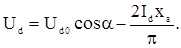 Неуправляемый выпрямитель можно рассматривать как частный случай управляемого выпрямителя, работающего с углом управления α = 0, поэтому основные соотношения, характеризующие работу однофазного неуправляемого выпрямителя на RL – нагрузку, справедливы и для управляемого выпрямителя. Важнейшей особенностью управляемого выпрямителя является его способность регулировать среднее значение выпрямленного напряжения Ud при изменении угла α. Уравнение регулировочной характеристики при работе выпрямителя на RL – нагрузку имеет вид Ud = Ud0 · сosα. (25) Регулировочную характеристику при чисто активной нагрузке выпрямителя рассчитывают по формуле Ud = Ud0 В формулах (25) и (26) Ud0 = 0,9 U2 - значение выпрямленного напряжения при α = 0. В выпрямителях средней и большой мощности возрастает влияние э.д.с., создаваемых в первичной и вторичной обмотках трансформатора их магнитными потоками рассеяния. Это влияние проявляется в относительном увеличении самих индуктивностей рассеяния, и в уменьшении активных сопротивлений в схеме. Влияние индуктивностей рассеяния обмоток трансформатора LS1_и LS2, а также индуктивности питающей сети Lc, учитывается суммарной индуктивностью La, приведенной ко вторичной (вентильной) обмотке трансформатора Наклон внешней характеристики в мощном однофазном выпрямителе определяется коммутационными потерями напряжения. Коммутационные потери напряжения, Udγ, в двухполупериодном нулевом выпрямителе рассчитывают по формуле Udγ = в мостовой схеме – по формуле Udγ = Udγ = Ud0 · сosα - Udγ. (29) или а) для нулевой схемы б) для мостовой схемы