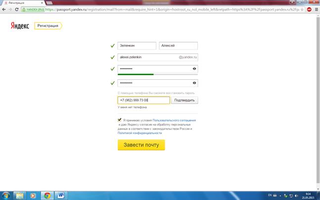 Практические задания: - Создать ящик электронной почты, и настроить его параметры. Для создания электронной почты необходимо зайти на сайт mail.yandex.ru (или на другие). Далее нажать “Завести почтовый ящик” и пройти регистрацию (заполнить все поля (“Имя“, “Фамилия“, “Логин“, “Пароль/Повтор пароля“, “Контрольный вопрос и ответ на него“, “Номер мобильного телефона”). После нажать “Завершить регистрацию”.