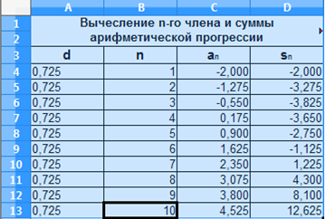 №1 Создать таблицу, вычисляющую n-й член и сумму арифметической прогрессии (Рис.1), используя формулы an=a1+d(n-1); Sn=(a1+an)*n/2, где n1 – первый член прогрессии, а d – разность арифметической прогрессии, а1=-2