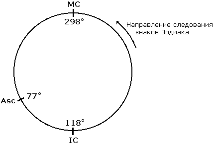где ГШ - географическая широта места рождения, ГШ = 59° 47'. Подставляя значения, получим Asc = 76,8°. Если Asc < 0, то Asc = Asc + 180°. При этом Asc должен попадать в левую половину круга (см. рис. 5), если Asc оказывается справа, то Asc = Asc + 180° (если получится величина больше 360°, надо будет эти 360° отнять, т.е. "отмотать" лишний круг).
