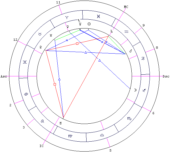 Это чаша с добавлением одной важной детали - напротив скопления планет в секторе 180° (или несколько менее) стоит одинокая планета или близкое соединение из двух планет (это как бы ручка корзины). В данном случае ситуация "чаши" меняется, можно сказать, кардинально. Дело в том, что в середине ранее пустой зоны появляется реальный объект для активной компенсаторной деятельности. Есть куда "сбросить" напряжение, связанное с неуравновешенностью карты. Таким образом, сфера жизни, с которой связана ручка корзины, становится очень важной (если не самой важной). Все остальные планеты (особенно если ручка связана с другими планетами через аспекты) начинают работать на эту отдельно стоящую напротив планету, т.е. все сферы жизни человека подчиняются одной цели, одному стремлению. В любом случае - это сильная индивидуальность, заметная личность. Человек "корзины" не растворяется в толпе, выделяясь в положительном или отрицательном смысле, часто чувствует себя одиночкой в этом мире, при этом его мировоззрение, способ мышления, идеалы очень устойчивы, его не переделаешь. "Корзина" может проявить себя двумя путями. 1) Способности не могут проявиться (допустим, "ручка" корзины - планета, слабая по знаку или пораженная). Человек вечно недоволен, вечный неудачник. Концентрация на чем-то одном, но со знаком "минус". Постоянные критика и недовольство другими, человек все время напряжен (как будто вечно на шиле сидит), конфликтен, т.к. энергия не может излиться в "мирных целях". 2) Человек выделяется из общего ряда, имея способность влиять на окружающих и стать центром действия. Его идеалы и мировоззрение заразительны, это лидер, прокладывающий свой путь. Такой человек проявляется как предводитель, учитель. Подобную конфигурацию можно увидеть в карте величайшего физика XX века А. Эйнштейна (14.03.1879, Ульм, Германия, GMT=09:50) - см. Рис. 11.