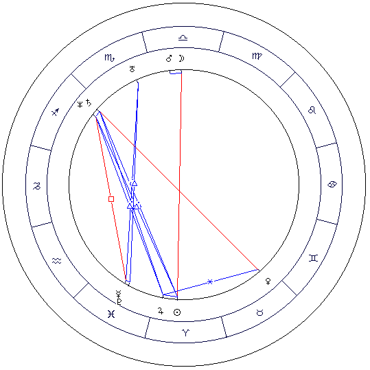 Такая конфигурация, когда планеты разбиты на две достаточно плотные группы в секторах менее 120° каждый, а между этими группами есть значительное пустое пространство (иногда планеты в группах могут быть в оппозиции друг к другу). Здесь две сферы жизни значимы, а остальные пусты. Такое распределение порождает реальный серьезный конфликт, когда человек вынужден разрываться между двумя реальными сферами, требующими внимания и приложения сил. Такие люди двойственны по своей природе, их жизнь может быть разорвана на две плохо согласующиеся между собой части, либо мышление устроено двойственным образом, раздвоение психики, как бы два человека в личности одного. Это могут быть и две жизни одного человека, проживаемые без связи друг с другом. Одним словом, ситуация разворачивается как конфликт двух начал или как двойственность существования. В любом случае уходит очень много энергии, все время надо поспевать на два фронта, необходимо удержать равновесие двух начал в одном целом. Это тяжелое испытание, у человека очень много энергии уходит на то, чтобы удержать целостность своей психики и не разрушиться. Типичный пример такой карты - космограмма нашего великого писателя Н.В. Гоголя (к сожалению, у меня нет данных о времени его рождения) - см. Рис. 14.