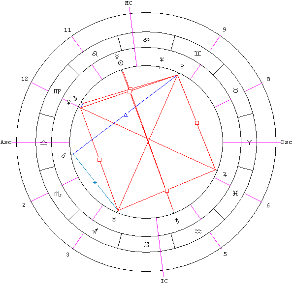Очень напряженная фигура. Образован четырьмя квадратурами и, как правило, двумя оппозициями. Замыкает человека в рамки жестких условий, что называется "двум смертям не бывать, а одной не миновать". Жесткие ограничения, которые воспринимаются человеком как давящие и создающие большое внутреннее напряжение. Квадрат дает очень много энергии, которая требует выхода. Люди такого плана рано взрослеют и кристаллизуются, их мировоззрение формируется рано. Это внутренне динамичные, но внешне непластичные люди. Их девиз: "не могу поступиться принципами!" Все это выливается в напористую, конфликтную позицию, человек часто действует как таран: "или грудь в крестах, или голова в кустах", т.е. или прошибает лбом стену, или разбивается о препятствие вдребезги. Если это квадрат с двумя внутренними диагональными оппозициями, то такой человек с детства активно ищет себя в разных сферах деятельности, занимается одним, другим, третьим, но при всей своей активности очень непластичен, всюду, куда попадает, стремится навязать окружающим свои представления и не восприимчив к реакции внешнего мира на его действия. Более мягкая ситуация, когда у большого квадрата нет внутреннего креста, например, отсутствует одна из оппозиций-диагоналей. В этом случае напряжение между полюсами не столь жесткое, больше пластичности, меньше динамизма. В целом крест не надо рассматривать как разрушительную конфигурацию (как это часто пишут во многих астрологических учебниках), результат часто положительный - через усилие и преодоление. Классический пример карты с Большим квадратом - радикс моего земляка, прославленного питерского актера Николая Черкасова (27.08.1903, Санкт-Петербург, GMT=09:20) - см. Рис. 17.