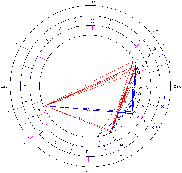 Этот подход мы описываем вторым, однако астрологи уделяют ему больше внимания, нежели первому. Закон тождества в этом подходе реализуется через тождество Зодиака микрокосма с Зодиаком внешнего космоса. В этом случае участок гороскопа субъекта, соответствующий, например, знаку Овен, имеет непосредственную и постоянную связь с Овном внешнего Зодиака, Телец микрокосма - с Тельцом макрокосма и т.д. И все, что происходит в конкретный момент времени на небесном Зодиаке, проецируется на Зодиак внутренней вселенной человека. То, что происходит в данный момент времени на небе в знаке Водолей, непосредственно отражается на участке внутреннего Зодиака субъекта, соответствующем Водолею. И если в карте человека на этом участке находятся какие-либо планеты или важные пункты гороскопа, Космос оказывает то или иное влияние на его (человека) состояние. Технически этот метод реализуется следующим образом: транзитные планеты помещаются в рассматриваемую карту на её внешний круг, чтобы не спутать с планетами данного гороскопа, помещенными на её внутренний круг. При этом транзитные объекты выделяются цветом, отличным от раскраски планет натальной карты. Далее, аспекты между транзитными планетами и элементами данной карты определяются обычным образом. Рассмотрим пример. В качестве натальной возьмем карту СПбАА (см. Рис. 6), начало работы которой приходится на 20 час. московского времени 5 октября 1989 года. Транзитная ситуация соответствует 23.11.1989. (см. Рис. 22) На рис. 22 транзитная Луна образует соединение с натальным Марсом и Солнцем, а поскольку последние образуют квадратуру с Юпитером, Нептуном и Сатурном, тем самым транзитная Луна "включает" натальный Т-квадрат Юпитер - (Марс-Солнце) - (Сатурн-Нептун). Одновременно активизируется секстиль (Марс-Солнце) - Луна. Таким образом, натальные аспекты не работают постоянно, а включаются транзитными планетами. Эти ситуации своеобразного "включения" и "выключения" натальных аспектов транзитными планетами дают широкую полифонию состояний человека. Date: 2015-06-07; view: 571; Нарушение авторских прав |