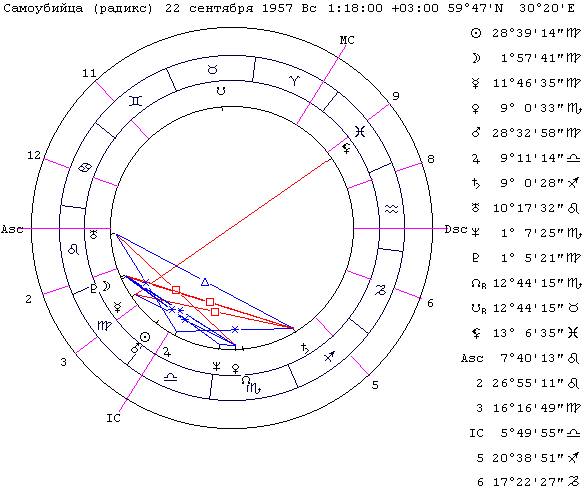 Сначала проанализируем натальную карту на предмет указаний опасности для жизни. Напомню, что для этого мы должны определить хилеги (это элементы I и X домов), абсциссоры (элементы VIII дома) и посмотреть аспекты между ними, используя правило трех указаний. Смотрим хилеги. 1) Солнце (управитель I дома). 2) Уран (стоит в I доме). 3) Плутон (управитель X дома). 4) Венера (соуправитель X дома). 5) Меркурий (младший соуправитель X дома). Теперь абсциссоры. 1) Уран (управитель VIII дома). 2) Нептун (соуправитель VIII дома). 3) Лилит - дважды элемент VIII дома, т.к. еще и стоит в VIII доме. Теперь смотрим аспекты между хилегами и абсциссорами. Будем брать только напряженные. 1) Уран одновременно хилег и абсциссор - связь по управлению. Раз. 2) Уран как абсциссор 90° с Венерой (хилег). Два. 3) Венера (хилег) в соединении с Нептуном (абсциссор). Три. 4) Меркурий (хилег) 180° с Лилит (дважды абсциссор). Четыре, пять. Итого пять указаний на опасность для жизни и преждевременную смерть. Но что указывает именно на самоубийство? Для самоубийц характерны положения управителя (соуправителя) I дома в VIII ("смерть по личной инициативе") или положение управителя (соуправителя) VIII дома в I доме ("смерть от самого себя"). Плюс к этому должны участвовать "уранические" показатели - элементы XI дома или собственно Уран. В данном случае все признаки налицо: управитель VIII дома в I, и это Уран. Если вспомнить про правило трех указаний, то на самоубийство это также распространяется, ищем три указания именно на самоубийство. 1) Уран (управитель VIII дома) стоит в I доме. Раз. 2) Уран (управитель VIII дома) 90° с Венерой (хилег). Два. 3) Меркурий (управитель XI дома и хилег) 180° с Лилит (дважды абсциссор). Три и четыре. Правило трех указаний выполняется. Обратите внимание на роль Черной Луны, без неё в данном случае нет всех указаний именно на самоубийство. По таким примерам как раз и определяется на практике, что Лилит - элемент VIII дома (т.е. всегда абсциссор), и определяется, с какими орбами она действует в аспектах. Здесь у нас как раз орб меньше 2,5°. Вывод: данная карта говорит о преждевременной смерти субъекта, причем через самоубийство. Вопрос: именно хилеги должны иметь отношение к XI дому? Ответ: нет, либо хилег, либо абсциссор. Например, совершенно равнозначны такие конфигурации: управитель I дома (т.е. хилег) стоит в XI в квадратуре с планетой в VIII доме (абсциссор); управитель VIII дома (абсциссор) стоит в XI в оппозиции с управителем X дома (хилег); соуправитель VIII дома (абсциссор) и одновременно соуправитель XI дома стоит в X доме - одна планета сразу элемент VIII, X, XI домов (такое может быть, например, в VIII доме Стрелец, в XI доме Рыбы, а Юпитер ретроградный стоит в Х доме) и т.п. Расскажу один любопытный случай из своей практики. У меня есть карты сестер-близняшек. Старшая пыталась покончить самоубийством. Разница между ними по времени рождения 20 минут. У старшей планета, управитель Asc, стояла в XI доме и повреждалась абсциссором, у младшей эта же планета уже "ушла" в X дом и перестала быть элементом XI дома. И у обеих еще два одинаковых указания на самоубийство. Таким образом, у старшей в итоге три указания на самоубийство, а у младшей - только два. Старшая пыталась покончить с собой, а младшая - нет. Вот вам правило трех указаний в действии. Одно указание в натальной карте потеряли, и событие уже не происходит. Вопрос: А причина самоубийства? Ответ: Причина не т