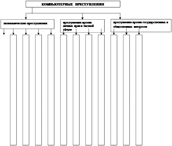 2.Особенностями компьютерных преступлений являются: Использование компьютеров, одного из самых современных достижений научно-технического прогресса при преступных посягательствах значительно повышает степень их общественной опасности; § Специфическим является характер наносимого при этом вреда, и, кроме того, ущерб от компьютерных преступлений, как свидетельствует мировая практика, обычно весьма велик (в среднем, потери от одного компьютерного мошенничества в США составляют почти 500000$, что на в несколько десятков раз превышает ущерб, наносимый при традиционном ограблении); § Проблемы, возникающие с выявлением самого факта совершения, с обнаружением и сохранением следов преступлений, совершённых с использованием ИВС либо в их отношении, с квалификацией анализируемой категории посягательств. 3.В 1983 группой экспертов Организации экономического сотрудничества и развития была предложена одна из наиболее общих классификаций компьютерных преступлений. В соответствии с криминологическими группами компьютерных преступлений этой классификации заполните схему.