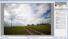 Перед тем, как обрабатывать файл, стоит остановиться и подумать, что именно вы хотели бы получить в результате коррекции. На рис. 17 перед нами довольно непримечательный пейзаж с серым, невыразительным небом. Поставим задачу создать картинку с предгрозовым настроением. Для этого, очевидно, придется сделать небо темнее, проработать облака. В целом контраст недостаточен, тональность для выбранного сюжета слишком теплая. Композицию нельзя назвать удачной - дорога в центре кадра делит его пополам. Исходя из всего этого, перейдем непосредственно к обработке.
