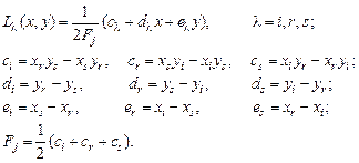 Полиномы L l, обладающие такими свойствами, принято называть функциями формы перемещений конечного элемента. После определения постоянных a 0, a 1, а 2, b 0, b 1, b 2 и приведения к виду (4.14) получаем следующие представления для функций формы L l: