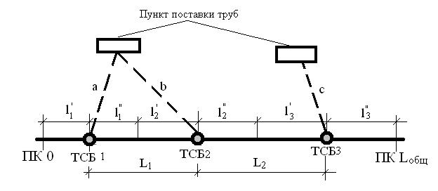 Из рисунка видно, что трубы на участок L1 можно поставлять и с первой и со второй трубосварочной базы (ТСБ). Поэтому условно разобьём данный участок на два –