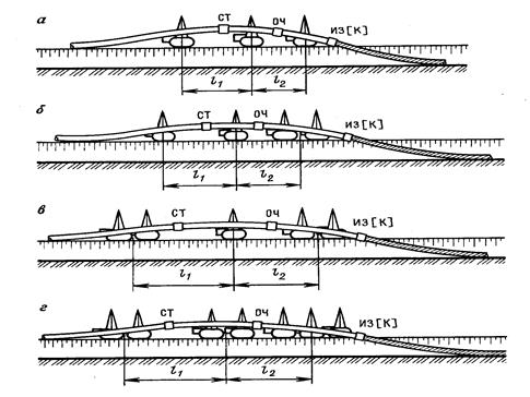 Задаваясь технологической высотой подъёма трубопровода в местах расположения очистной машины hоч (относительно поверхности строительной полосы) и изоляционной машины hиз (относительно дна траншеи), исходя из конкретных условий трассы, определяются значения комплексов: Ι комплекс – ΙΙ комплекс –