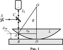 Для виконання лабораторної роботи студенту попередньо необхідно: знати фізичну суть явища інтерференції світла (§2.1.1), вміти описати утворення інтерференційних смуг однакової товщини та кілець Ньютона (§2.1.4; §2.1.5) Прилади і матеріали Мікроскоп, плоскоопукла лінза великого радіуса кривизни, плоскопаралельна пластинка, освітлювач з блоком живлення, світлофільтри Теоретичні відомості та опис установки Оптична схема для спостереження кілець Ньютона у відбитому світлі в даній лабораторній роботі наведена на рис. 1. На предметному столику мікроскопа знаходиться плоскопаралельна прозора скляна пластинка, а поверх неї – плоскоопукла лінза L. Монохроматичний пучок світла від освітлювача S направляють на скляну світлоподільну пластинку С, яка розміщена під кутом 45° до напрямку поширення світла. Після відбивання в точці А опуклої поверхні лінзи і дотичної до неї поверхні пластини в точці В світло поширюється у зворотному напрямку паралельним пучком та потрапляє в об’єктив мікроскопа L 1. Відбиті хвилі є когерентними. Всі точки, що знаходяться на однаковій відстані