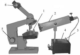 Рис.2 1 – плоскоопукла лінза; 2 – освітлювач; 3 –вмикач–вимикач освітлювача; 4 – блок живлення освітлювача; 5 – поворотний гвинт тубуса мікроскопа; 6 –мікрометричний гвинт окуляра мікроскопа.