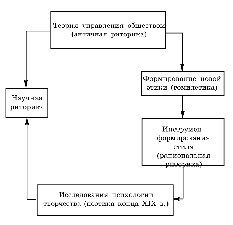 На схеме 1.13 показано, что развитие теории речи --- риторики --- совершает как бы своеобразный круг, в котором общественные задачи риторики как исходного средства существования и развития общества дифференцируются по своим частным задачам и интегрируются снова в научной риторике. Схема 1.13